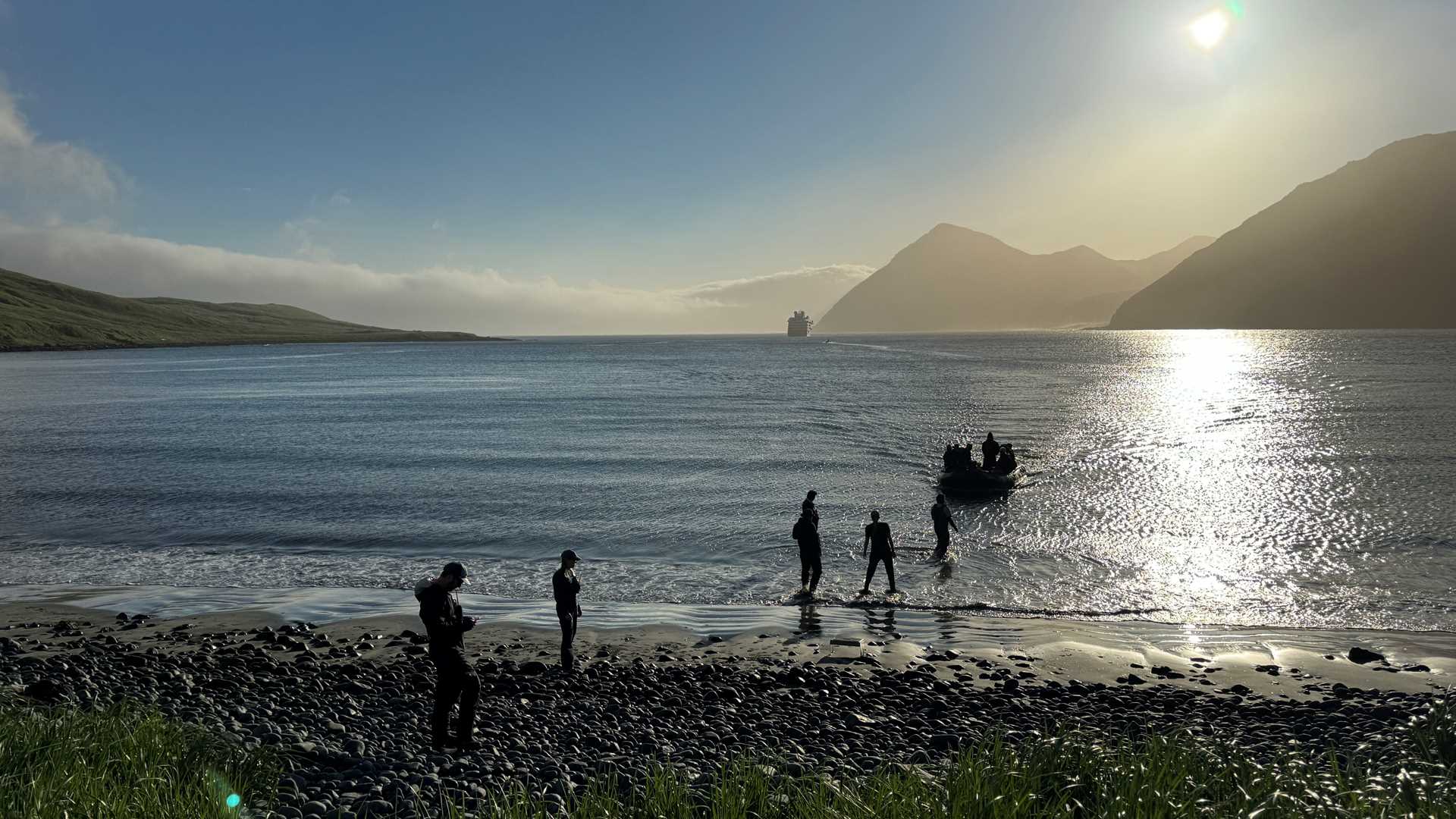 During a perfectly timed BBQ lunch on deck in the rare sunshine of the Aleutians, we repositioned to Wall Bay, a true expedition stop, a place where no one on board had ever been before. Some of us kayaked and some went for a walk among the reindeer and the bald eagles.