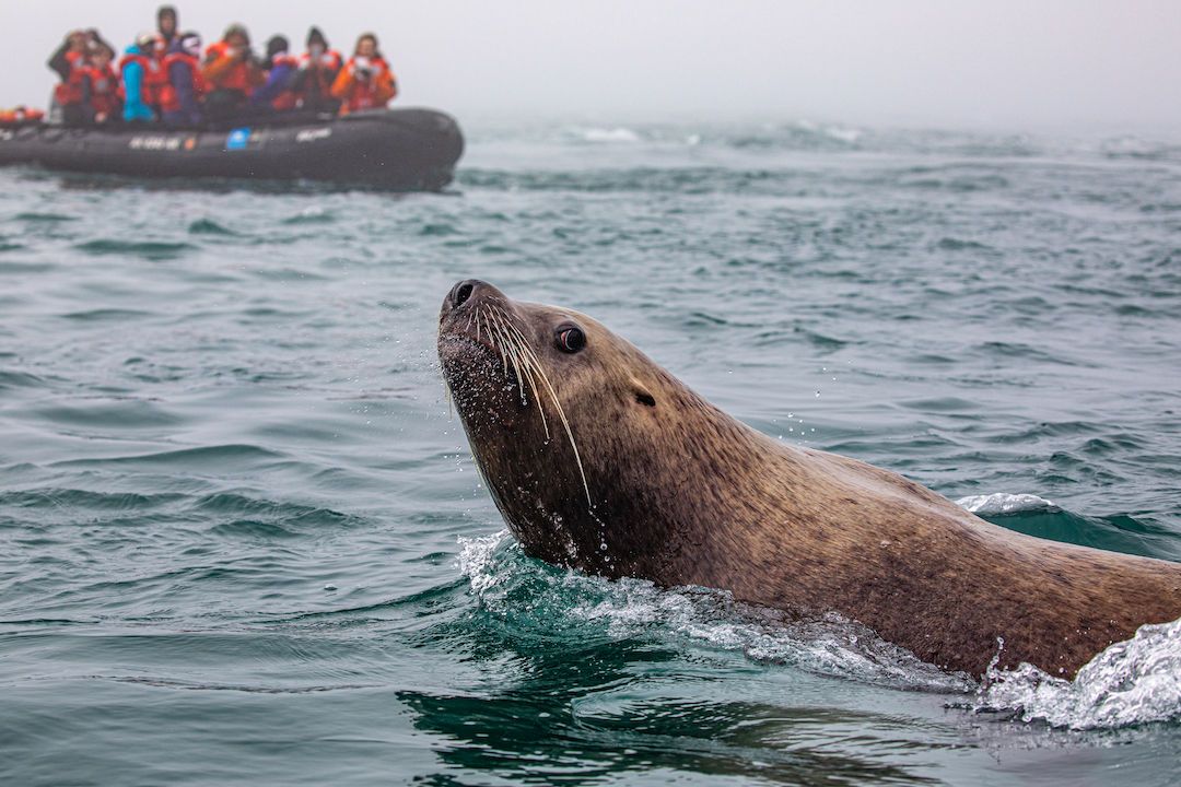 On the last full day of our voyage, we woke in Endicott Arm near the Dawes Glacier. We spent the morning enjoying Zodiac tours to the face of Dawes Glacier and watched multiple calving events. We were also able to spot several harbor seals, waterfalls, and a couple harbor porpoises on the way. After lunch we had the opportunity to participate in a polar plunge. Forty people decided to brave the frigid water for a short swim. Those of us not eager to jump into glacier water were able to watch from the bow. After the polar plunge, we warmed up on board as we started transiting towards Juneau. On the way, we stopped at a beautiful waterfall to once again admire the amazing natural beauty of Alaska. During our farewell recap, we were treated to a quick visit by a humpback whale. We ended our day with a slideshow made up of our favorite photos and memories of an amazing week on board National Geographic Quest .