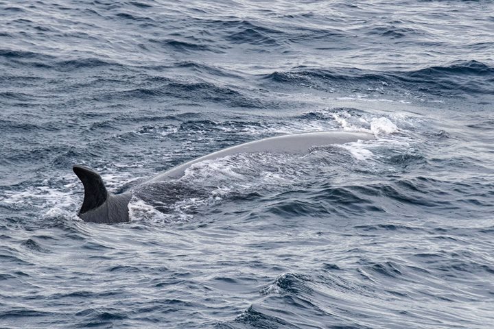 As we left the South Orkneys and headed for the South Sandwich Islands, we started to see blows of whales. First, there were a few blows, then several blows, then more and more blows visible all around the ship. We were sailing in whale soup! Everywhere we looked, whales blew at the surface. On closer inspection, we found that these were fin whales by the hundreds, in addition to a smallish blue whale and a smallish humpback whale amongst the group. The whales were sub-surface feeding on krill in the area. In the collective memories of all staff on board, we have never seen so many fin whales in one spot. It truly was a whale of a day!