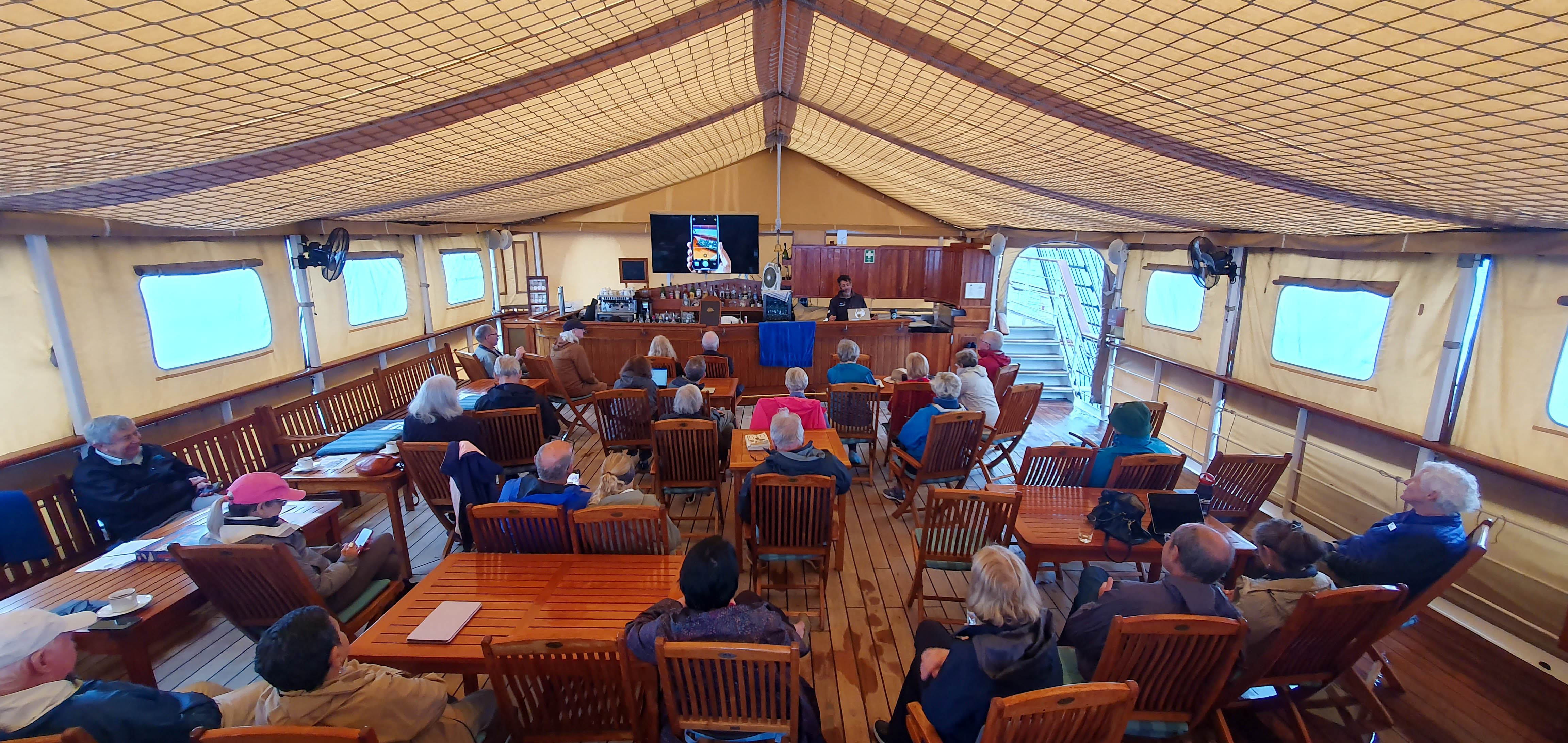 The sea was glass-calm this morning. The sailors went aloft, and we were at full sail by 10AM. Just after the justifiably famous Sea Cloud pasta wheel lunch, a strong squally developed on the starboard side with strong winds and heavy intermittent rain blowing perfectly from the east. We all rushed out to the spanker deck as our sails were billowing, filled with wind. We went from 2 knots per hour in minutes to 7.2 knots. It was exhilarating and we all reveled in the fact that we were at sea in a ship designed for such weather. We cut through the white caps with such ease and there was barely a movement on deck. We were at sea, transported back in time on a ship designed to mimic the great clipper ships of the mid-19th century. It was exhilarating and it was apparent as we looked up at the gleaming, billowing sails. Tonight, our captain introduced his officers and then our expedition leader John Frick spoke about the wonders of our journey. Lastly, we enjoyed the captain’s farewell dinner.