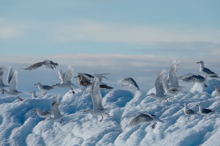 Early this morning, we awoke north of the Arctic Circle with lovely weather as we entered the harbor at Sisimiut. There were many options for a long morning ashore, from an energetic mountain walk to leisurely strolls through town. We all arrived at the outdoor museum grounds for a tasting of traditional Greenlandic foods and had a chance to visit the historic buildings. The houses in town visually, virtually vibrated with their bright colors in the brilliant sunshine. In the afternoon, a short transit north from town found us alongside a small uninhabited island, perfect for a few hours of sunny exploration. After careful scouting by the expedition team, we were able to free roam along the seashore and over the rocky hills. Some places were covered with a thick, soft carpet of tundra vegetation, and numerous gulls wheeled overhead in the breeze.