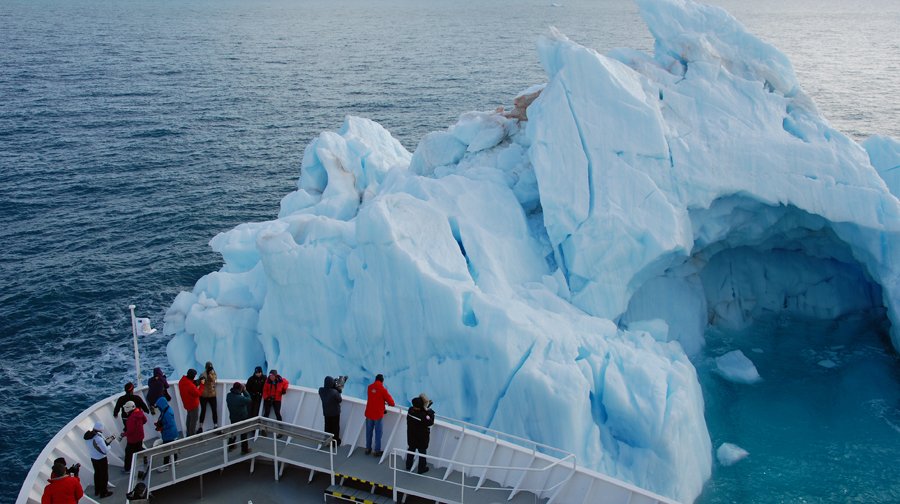 Travelling up the arm, we saw seawater turn from dark green to a beautiful jade color, sure sign that a tidewater glacier was near. Bergs appeared, and some here were huge. And at last we spied the Dawes Glacier. We hopped into our small rubber boats to get an intimate view of our surroundings. From small boats, the icebergs were all the more impressive, and many were large enough to resemble miniature mountain ranges, with saw-toothed edges, or were broad enough so that, fitted with crampons, one might play a tolerable tennis game. Other bergs were smaller and were formed as to resemble swans, whales or dragons. Seals lay about on some of the bergs. They come here to give birth to their pups, and though drivers did all we could to leave them undisturbed, we did manage to get a few good looks at these whiskered sausages.