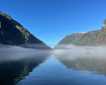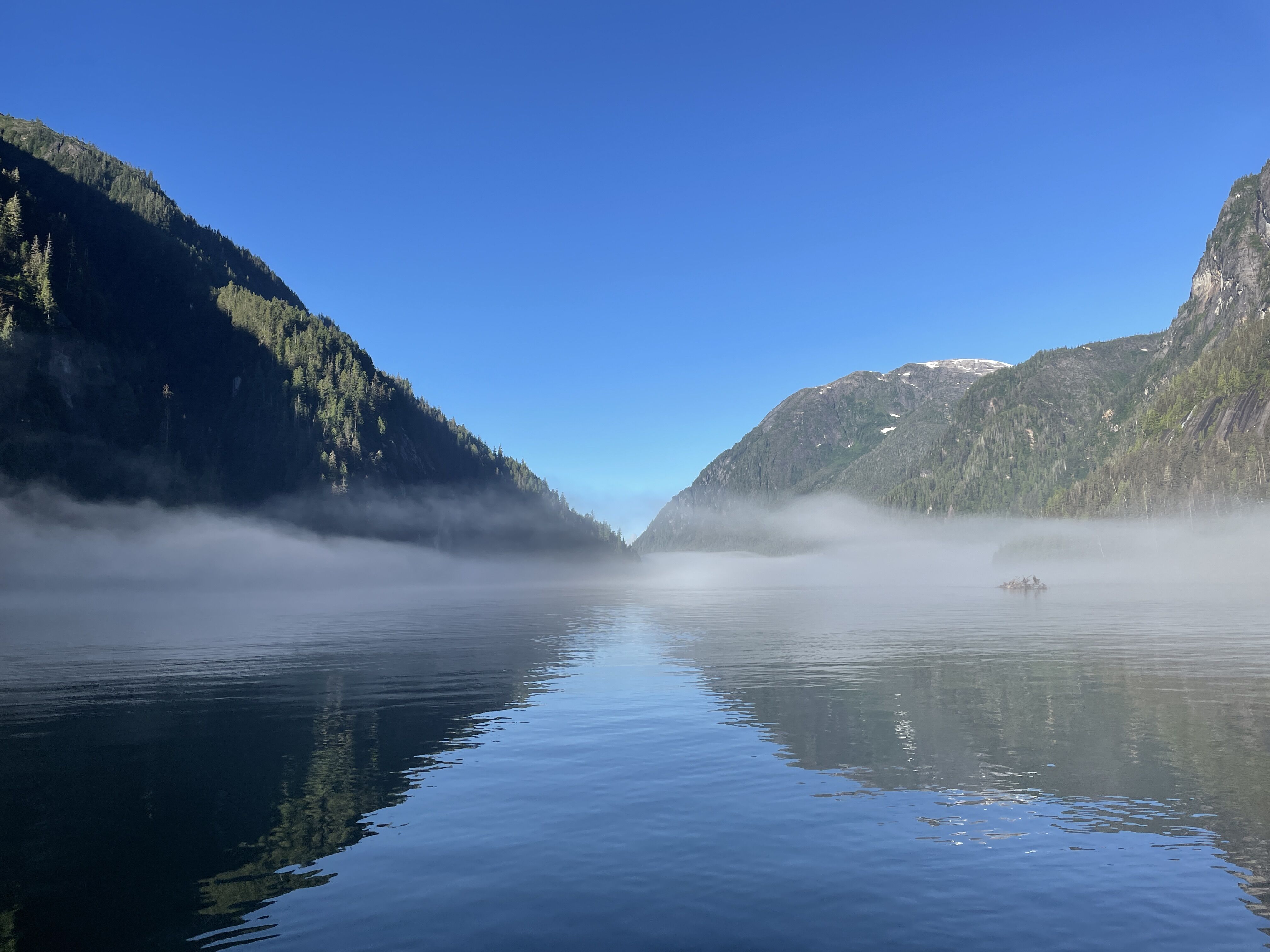 In the early morning, National Geographic Sea Lion crossed over the terminal moraine of the glaciers that formed Endicott Arm and Tracy Arm. Mist lined the sides of the glacially carved fjord walls, and fog shrouded the valleys and the waterway.