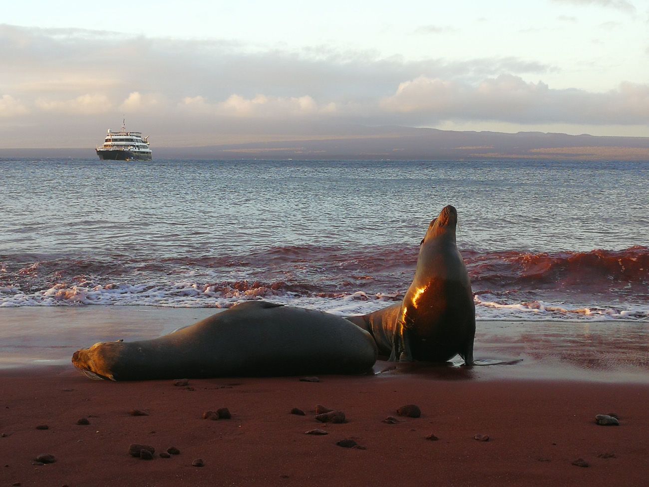Due to the productive waters of the west, we also observed large aggregations of marine iguanas and sea turtles that feed on marine algae. We also saw flightless cormorants, one of the unique species that inhabit this region, one of which came on board one of our inflatables Zodiacs—it was quite a moment! Male marine iguanas are starting to show their mating behavior—they will establish territories and will fight other males that dare to trespass.