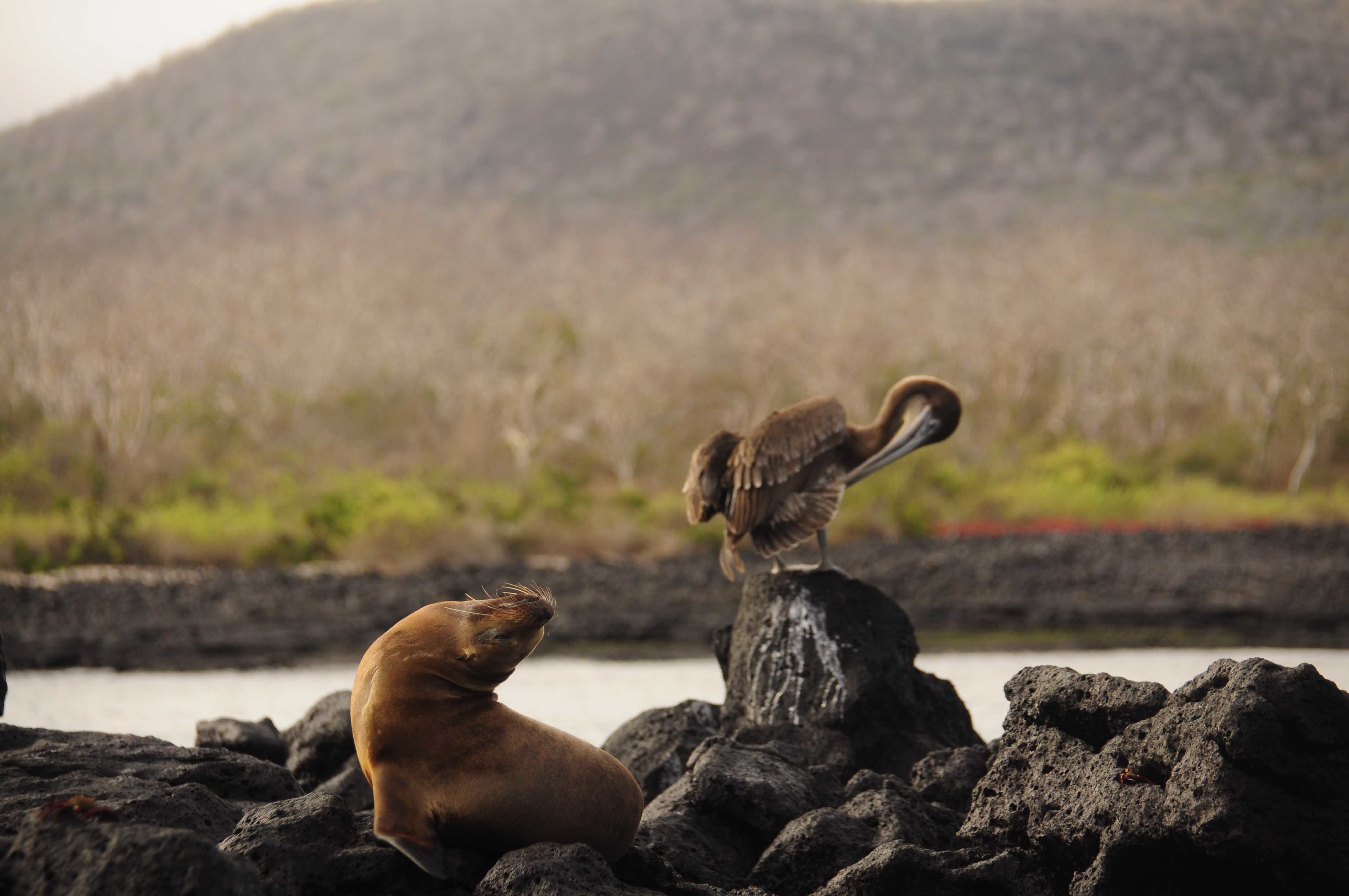 We started the day with excitement as we landed on the beautiful, pristine coast of Isla Genovesa - a true birder’s dream. Along the sandy beaches and steep cliffs of Darwin Bay, we were surrounded by an incredible array of birdlife. Frigatebirds soared closely overhead with their red pouches on full display, while Nazca and blue-footed boobies nested along the rocky ledges. Swallow-tailed gulls called out as we walked past. In the distance, we saw the stoic and elusive short-eared owl. The island was alive with color, sound, and constant movement. Between our excursions to Isla Genovesa, we snorkeled near Prince Philip’s Steps and discovered a vibrant world beneath the waves. Schools of fish swirled around us, a fur seal turned in the water as if dancing on cue, and sea lions relaxed nearby. As our last snorkeling adventure came to a close, we spotted a sea turtle resting calmly in a crevice. As the sun retreated into the sky on our last return to National Geographic Endeavor II, we reflected on the sheer magnitude of what we witnessed on our last full day. Isla Genovesa, like the other islands, gave us a connection to a sacred world. The harmony between land, sea, and sky reminded us how deeply interconnected, vital, and fragile these ecosystems are. Watching birds tend to their nests and marine life swim effortlessly, we were struck by how little space there is between wonder and reverence. We recognized that our journey wasn’t just about observing unique wildlife, it was about feeling part of something grander and beautifully ancient.