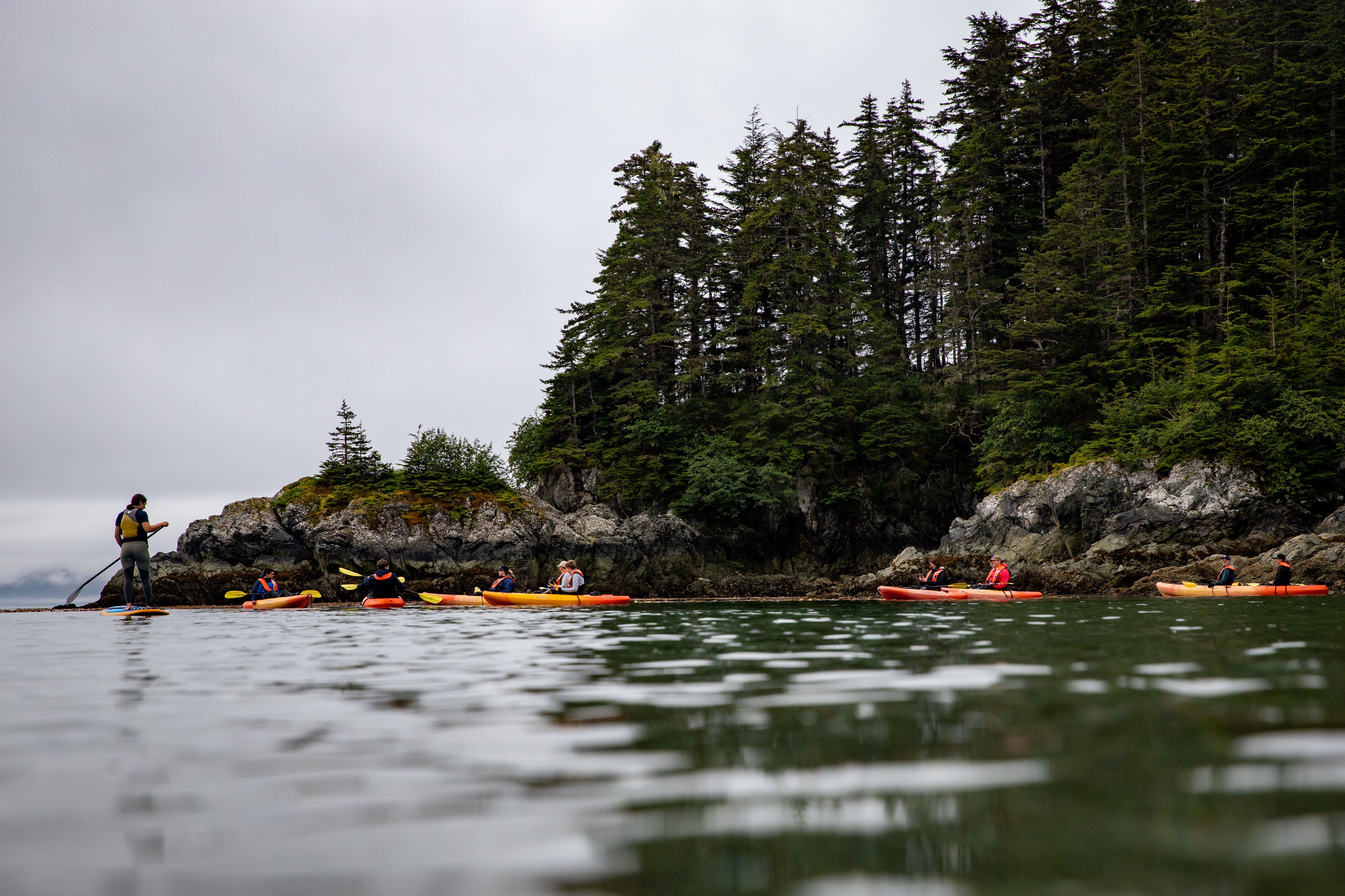 Soon after, Zodiacs zipped guests off to view some coastal brown bears. Once onshore, we came upon the falls after a short walk. Guests had a seat and to the delight of all, a pair of sibling juveniles came to fish for salmon. Soon after, a mama with two yearling cubs also came out to enjoy the easy, rich picking of salmon at low tide. Everyone observed with awe and admiration. It was an amazing experience to be so close to nature that we could view the intricate cycle of life and nutrients from salmon to bear.