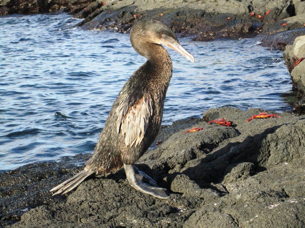 Everywhere we walked we observed many marine iguanas whose black bodies looked as petrified as the rocks. On beaches, sea lions rested, while in the shallows the juvenile sea lions went on playfully in their own small world. Along the way, we came across our next non-flying bird, the flightless cormorant. We observed some on the rocks, drying their wings, and others in the water collecting algae and fish. The sunset along the west hearkened all sea birds back to their nests, ultimately lending us one last view of this magical place: two Galapagos hawks flying close to the rocks and on the hunt for iguana, a few of which rested placidly on the warm rocks.