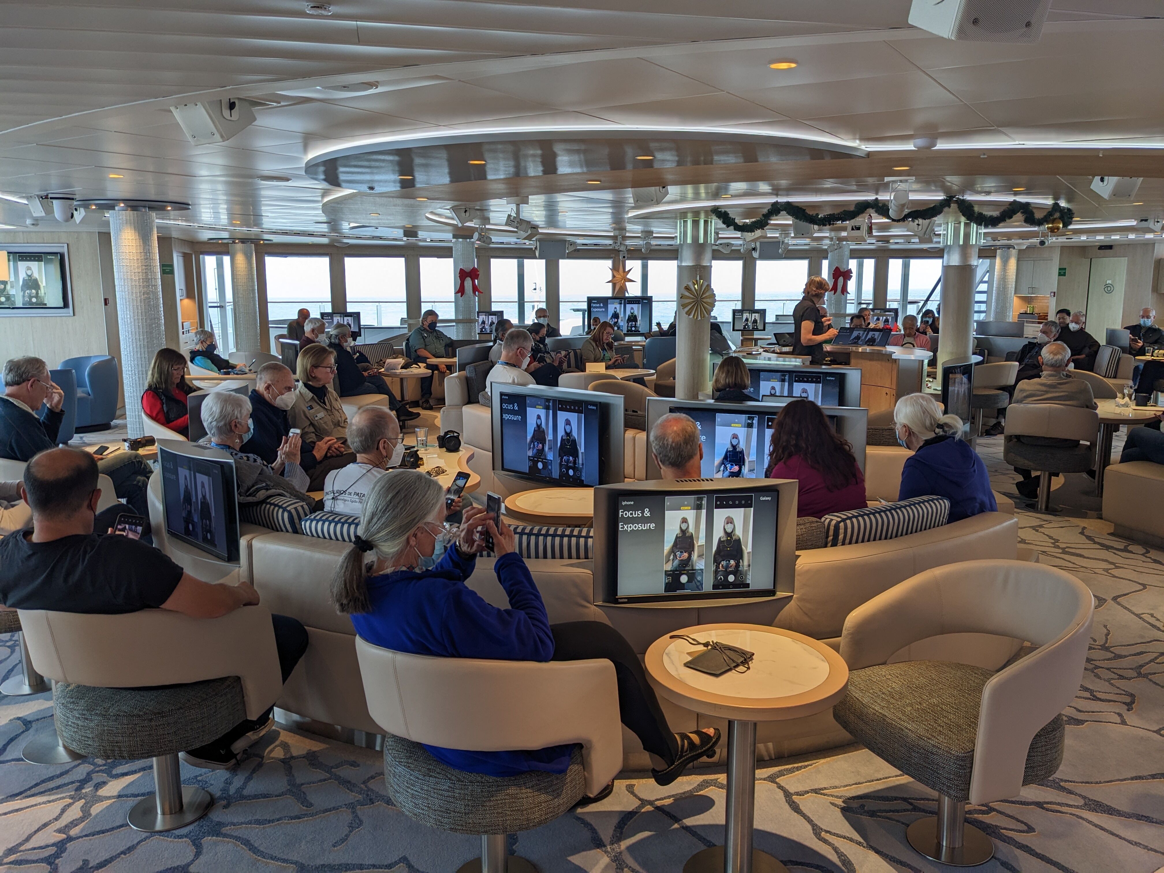 We returned to National Geographic Islander II to prepare for the next outing. Some of our guests enjoyed the rest of the morning on the beach, while snorkelers left Darwin Bay to go swimming along the caldera. They observed so much marine life, including trumpetfish, Moorish idols, playful sea lions, pompanos, and whitetip reef sharks.