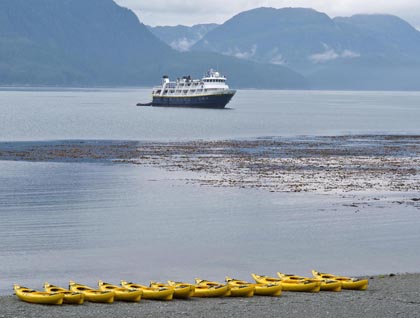 During the day National Geographic Sea Bird cruised through the park. The guests marveled at the sights—a view of the Fairweather mountain range, snow peaked mountains that rise straight out of the saltwater. Down many of these twisting steep channels one will find phenomenally massive, ancient glaciers. Some of these are receding rather rapidly, the Marguerite glacier calves off six feet per day from her facing edge, for example. The show these glaciers give off is exhilarating, the thunderous noise the glacier makes when she drops a 200-foot-tall chunk of ice is one no guest will ever forget.