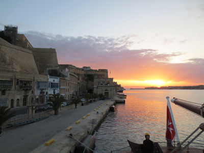 Our first full day aboard Sea Cloud began with an early morning departure from the Grand Harbor of Valletta. Early risers enjoyed a beautiful sunrise over the 16th-century Fort St. Angelo, a structure that survived the Ottoman siege of the island in 1565. Light cloud cover filtered the morning sun as we maneuvered past the honey-colored stone walls of Valletta, but the sun reappeared as the crew hit the rig for a leisurely morning under sail.