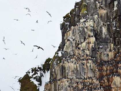 Kapp Fanshawe is one of the greatest nesting cliffs on Spitsbergen Island and also a very scenic spot. We nosed in to look at the dramatic sheer cliffs of the Cape. The ledges are home to one of the greatest concentrations of Brünnich’s guillemots in Svalbard. At the height of the season there may be more than 200,000 individuals thronging the lower half of the cliffs. A similar number of black-legged kittiwakes nest there as well, mainly above the guillemots. We saw a great number of kittiwakes swarming close to the cliffs, and guillemots by the thousands were winging back and forth between the cape and the sea, some with fish in their beaks. When the chicks are only one-third grown, the adult males call each chick off the ledges, barely able to fly. Once down on the sea surface they can swim like a fish. Each male parent then leads his chick out into open water where they will spend the winter together, learning to dive, fish, and feed themselves. Many guests braved the chilly morning out on deck to take photos or just marvel at the incredible scenery and the myriad of birds.