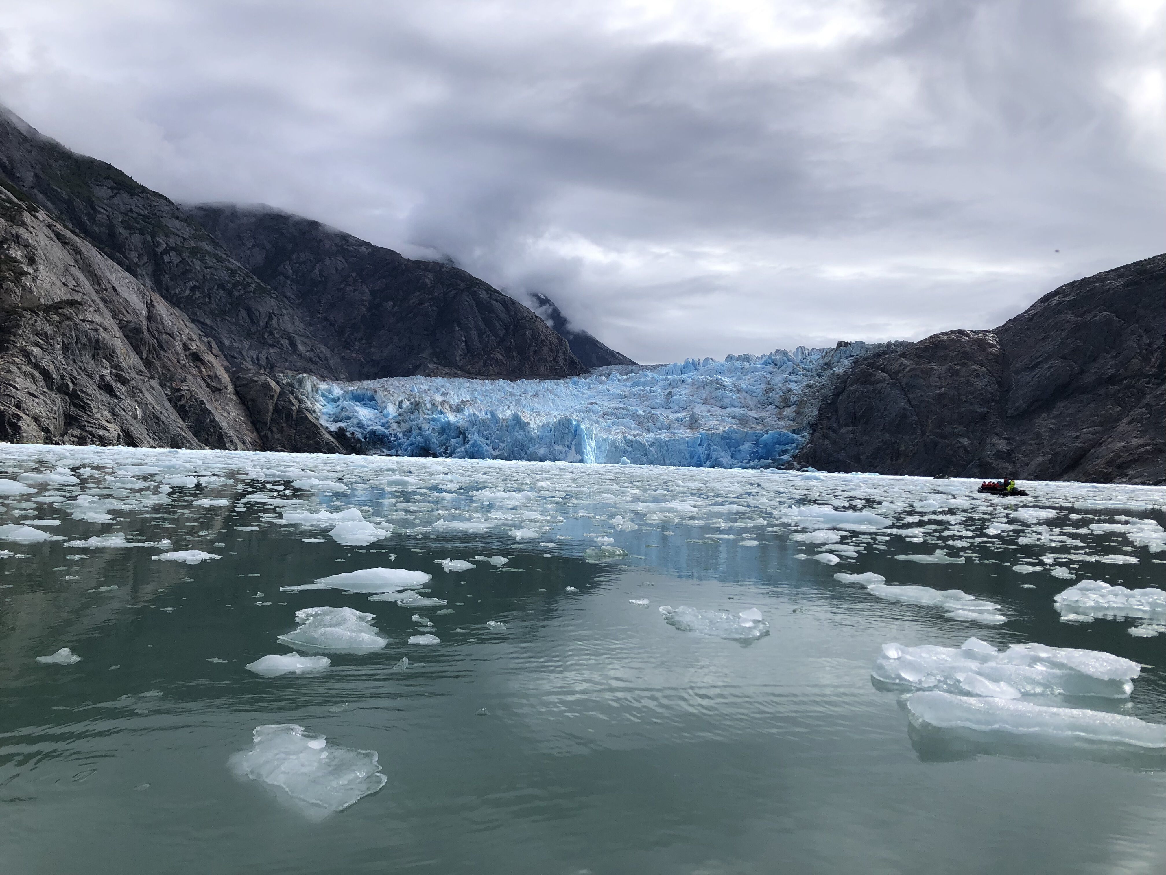 Today, we embarked on a voyage through the breathtaking Endicott Arm, a 30-mile fjord carved by ancient glaciers. As our vessel glided through the jade-green waters, towering granite cliffs rose on either side, with cascading waterfalls fed by melting snowfields. The fjord's serene beauty was punctuated by the occasional splash of harbor seals diving from ice bergs and the distant sight of mountain goats navigating the rugged terrain. Approaching the terminus of the fjord, the awe-inspiring Dawes Glacier came into view. Standing over 500 feet tall and half a mile wide, its icy facade shimmered in hues of blue and white. We boarded Zodiacs to get a closer look, maneuvering through a maze of icebergs, each uniquely sculpted by nature. Suddenly, a thunderous crack echoed as a massive chunk of ice calved from the glacier, crashing into the water below and sending ripples across the fjord—a humbling reminder of nature's power. The journey through Endicott Arm was more than a scenic cruise, it was an intimate encounter with the raw, dynamic forces that shape Alaska's wilderness. The memories of shimmering glaciers, playful seals, and towering cliffs will linger, a testament to the allure of this pristine frontier.