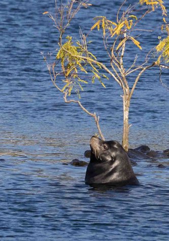 We proceed on into the lock at Bonneville Dam. Our sailors expertly throw a line over a floating bollard on our starboard side and this keeps our ship fast to the side of the lock as the great barn-door gate closes behind us and the lock begins to fill with water. The water flows in and the ship begins to rise in the lock. Meanwhile, we are gathered on the bow and we sing a rousing version of Roll On, Columbia Roll On, led by our expedition leader, Rab. Soon the water in the lock is at the level of the lake behind the dam, and the sailors take off the line and we sail forth 90 feet higher than before. Our sharp-eyed staff member, Jeff, spots a California sea lion bull; this animal has also come upriver through the lock.