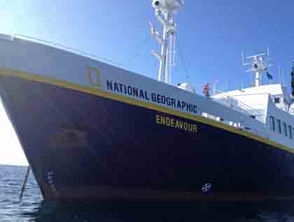 Others explored by expedition landing craft. In addition to enjoying the scenery, boaters saw the remains of a pearl farm. Pearling has long been a part of this region’s history, and this operation, though extensive, is just the most recent iteration of collecting beauty from the least-likely seeming source. Pearlers gone, the jetty they made is now the home of frigatebirds. These birds are masters of the air, huge, and yet delicate, they vie with hummingbirds for being the most completely aerial creatures ever to live. And so they are somewhat awkward on the ground. We saw them perched on seaside rocks and in mangroves clotted with guano. The birds were engaged in every sort of behavior, sleeping, preening, and squabbling. Most spectacular were a few males that had inflated their bizarre and brilliant throat sacs into scarlet balloons in hopes of enticing an available female.