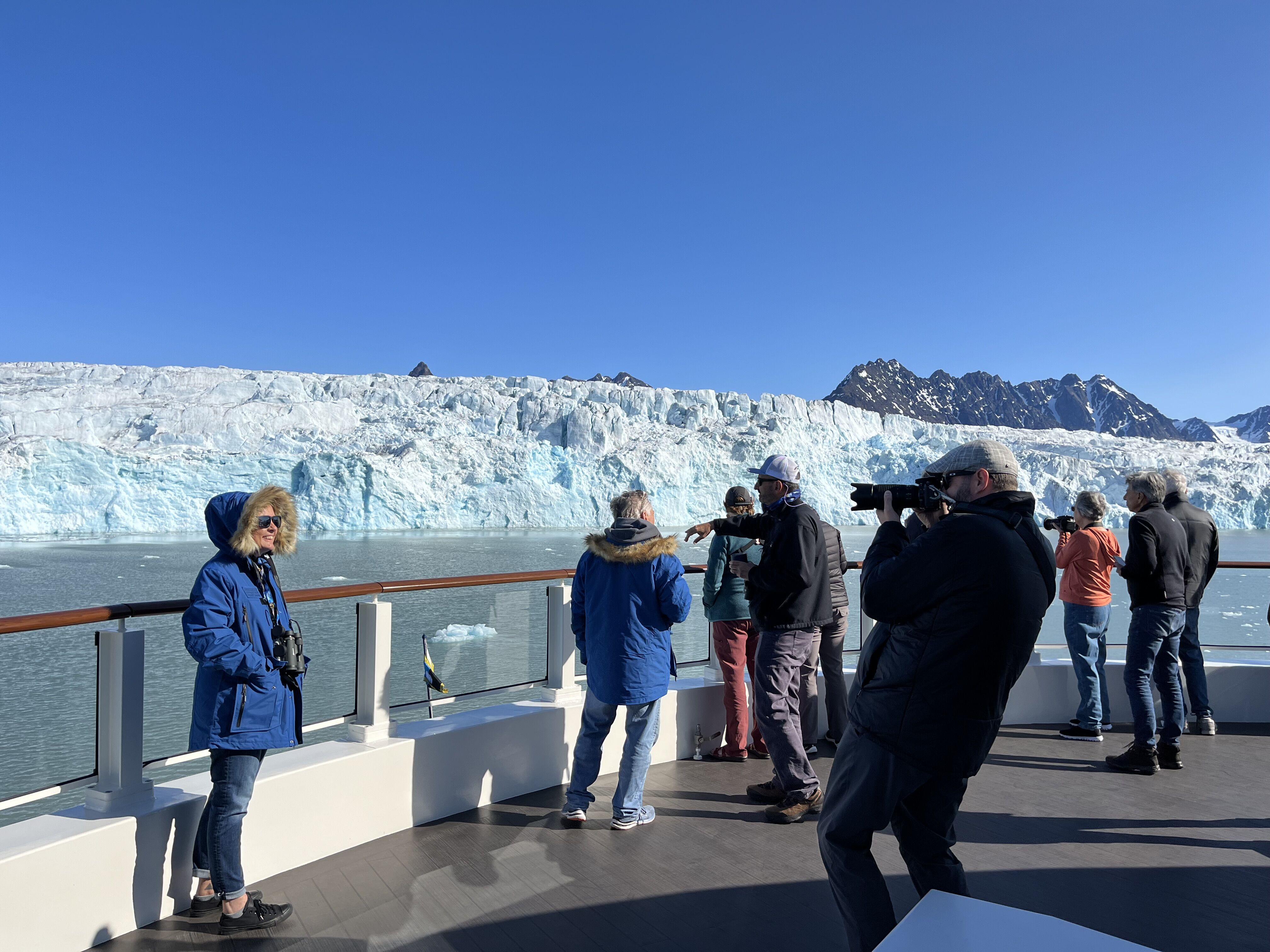 Blue skies in the High Arctic marked the start of the day on board National Geographic Endurance. We were all excited about the beginning of our expedition in Svalbard. During the morning, a keen expedition team introduced themselves to the guests. This was followed by a series of briefings that left us better prepared for the next few days. All this happened as we sailed along Krossfjord, a large fjord system located in the northeast of Spitsbergen, the largest island of the Svalbard archipelago. At the end of the fjord, the ship offered spectacular views of Lilliehookbreen, the largest of several glaciers present in the area. We all enjoyed the sound of the calving ice and views of kittiwakes, auks, and arctic terns as the birds fed in the water, flew around the ship, and rested on glacial ice.