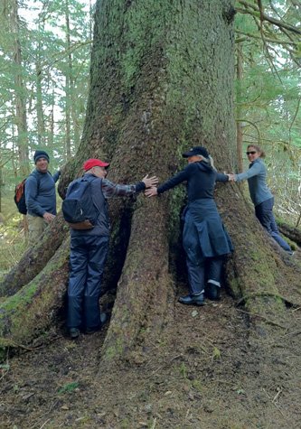 And so it began. We awakened aboard National Geographic Sea Lion in Hood Bay, a succession of four or five “Pffttt” outbreaths of the humpback whale, followed by curving arch of the back to reveal the tail fluke as it dove down for several minutes of feeding before coming back up for breaths. The backdrop: grayish-white fog clinging to evergreen tree-lined shore, and several shadings of gray layering the skies above. A typical morning in Southeast Alaska. We cruised through Hood Bay, and along the shoreline of Sitkoh Bay, enjoying the quiet muted scenery, keeping eyes out for wildlife. In the late morning many gathered in the lounge for the “Photography Essentials” presentation and breakout sessions with cameras.