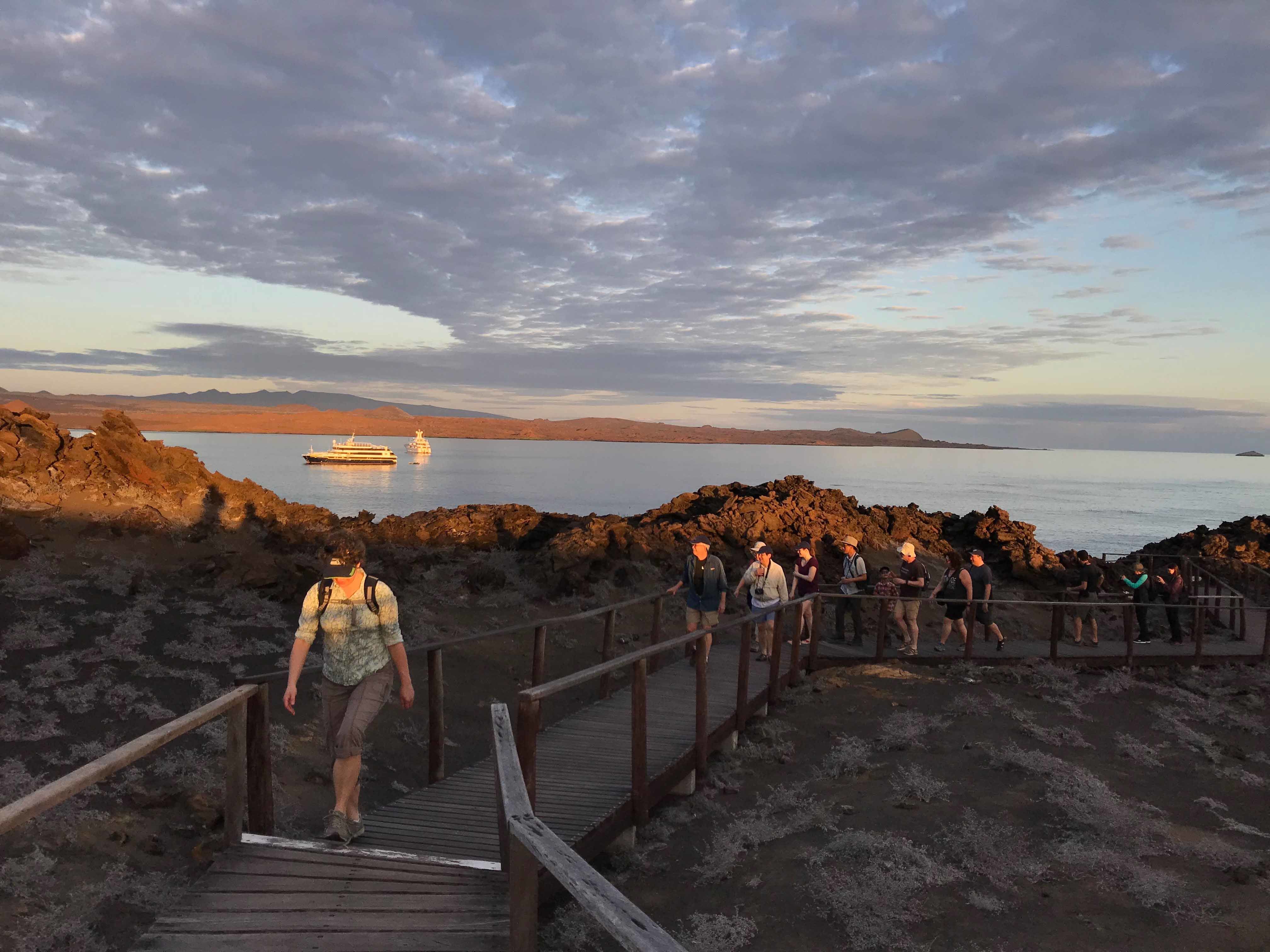 Once securely anchored the guests were excited to board the small boats after breakfast for an expedition landing craft tour along the two small volcanic ash islets. From the small boats, guests viewed the California sea lions hauled out on the rocks scratching and lounging near the water’s edge. Looking toward the upper reaches of the rocks blue-footed boobys were making nests and displaying their courtship behavior. A few brown pelicans flying overhead scan the surrounding waters for an early morning breakfast of fish.