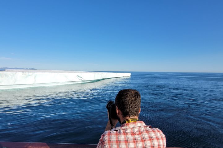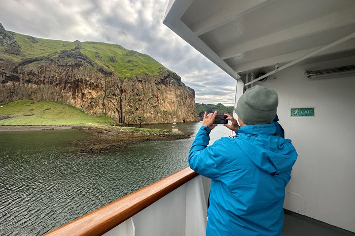 We started the day with beautiful weather and a gorgeous sail into Heimaey. An adventurous group from National Geographic Explorer hiked up the volcano that threatened the city in 1973, and others took a panoramic tour of the area. The grand finale for everyone was a visit to the Volcano Museum, which is built around a house that was partially destroyed in the eruption. In the distance, we could see steam and gases from a new volcanic eruption. After leaving Heimaey, we sailed around several of the Westman Islands, where the only ‘residents’ are seabirds nesting on the cliffs. Gannets, northern fulmars, puffins, black guillemots, and red-necked phalaropes were prolific. We found a large group of gannets diving into the water to catch fish. Several minke whales were spotted briefly before we headed off for our visit to Surtsey, which we circumnavigated. After the guest slideshow and the Captain’s Farewell, our ship sailed by National Geographic Resolution as we passed the newly erupting Litli-Hrutur.