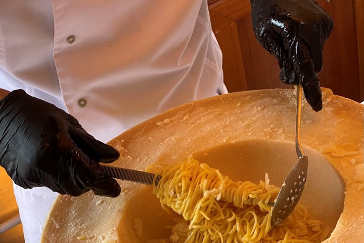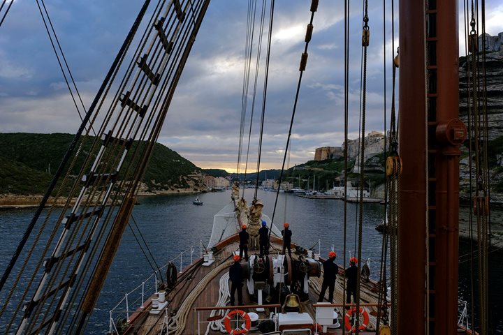 We left on our tour of the city at 9:00 a.m. and walked a short distance from our coach to the wonderful market. Our visit started in the fish market. It had the most incredible arrangement of fresh fish I have ever seen – all the colors of the rainbow, including bright reds, pinks, greens, and blacks. It was spotless, and there was hardly any smell. We then walked into the vegetable and cured meat area. There, an enterprising merchant treated us all to some wonderful, sliced Iberian “black pig (Porc Negra)” ham. Judging from the responses, all loved it. Our visit concluded with a light tapas luncheon at the Cristal Café. The food and wine were scrumptious. I was struck by the most beautiful Murano glass chandeliers which appeared to be antiques. The glass had a subtle green shade in places. We returned to the port and found all three Sea Clouds berthed in a line, with the original Sea Cloud first, of course! We then had a light lunch, as we had just returned from eating.