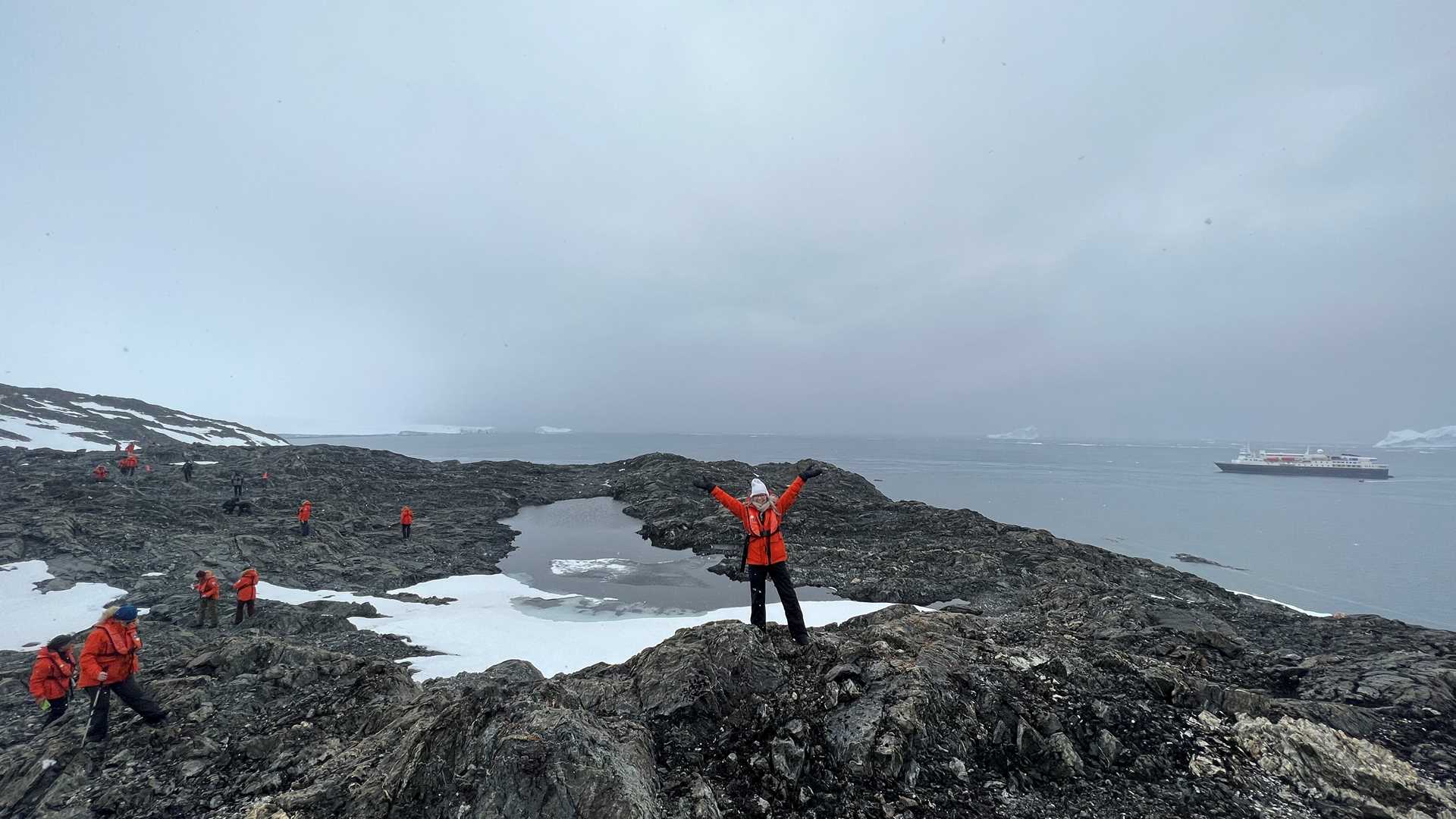 This morning, we set foot on the Antarctic mainland for the first time and had the unique opportunity to visit Pitt Point, an area of the peninsula that has remained almost entirely unvisited since it was last used by Argentinians as the site of a small refuge. Amongst the remnants of a sledge, once hauled over ice that is no longer present, we were treated to some of the most fascinating geology and plant life we’ve seen yet. A winding hike over crumbling slate with swirling slivers of white intrusions led us along light brown “rhyolitic” rocks thought to be affiliated with the opening of the Weddell Sea. Eventually, we came to a small lake surrounded by bright orange lichen, delicate moss, and a panoramic vista of the Prince Gustav Channel. Those who opted for a Zodiac excursion got close-up views of one of Antarctica’s top predators, and curious leopard seals peeked their reptilian heads up to take a look at today’s unusual visitors.