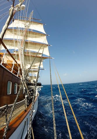 “Sails in order!” called the captain, echoed by the bosom relaying the command to the three mast captains. Sheets were hauled, clew and bunt lines slacked, halyards hoisted yards, and yardarms were braced in a complex but coordinated flurry of action. At first I was surprised that Captain Komakin was going to set the higher topgallant sails with the wind so strong, but Sea Cloud is about the true square-rigged sailing experience and we all felt the thrust of power and the heeling of the ship when the topgallants were set. Seven and a half knots was the speed as we all moved forward for the setting of the jibs and the forecourse. This is what we came for! By late morning we were sailing at a roaring 9.5 knots, with the south end of Martinique passing to our starboard side.