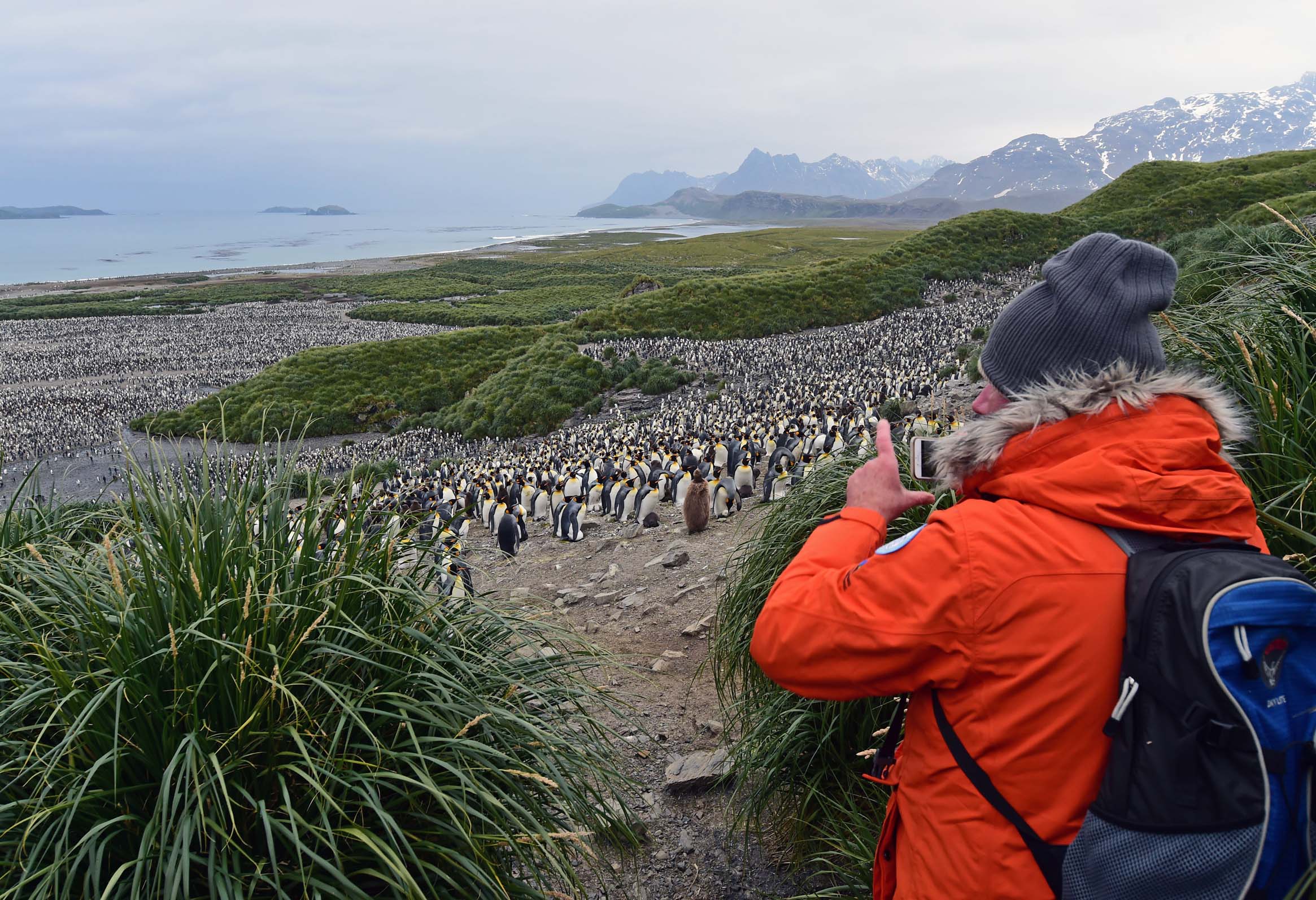 With its overwhelming wildlife, South Georgia well deserves to be called “The Serengeti of the Southern Ocean.” Today we had the fortune to walk amongst tens of thousands of colorful king penguins—literally “a field of gold!” We thought that yesterday´s encounter with the kings in Right Whale Bay might have been hard to exceed, but today we realized that yesterday´s landing was just a taste of what was to come. Today we heard expedition leader Russ´ voice already at 5:30 a.m., calling out for a landing at Salisbury Plain; not only the second largest colony of king penguins on South Georgia, but also rich in other birds and marine mammals: skuas, petrels, the South Georgia pipit, the South Georgia pintail and seals. Holding an estimated 60,000 breeding king penguin pairs plus chicks, this site is truly one of the most spectacular places to visit on South Georgia. Although the sun was hidden behind clouds, the light was soft and great for photography. Many a guest reluctantly finished watching and clicking their cameras before they had to pack their gear and jump on the last Zodiac left to leave the beach.
