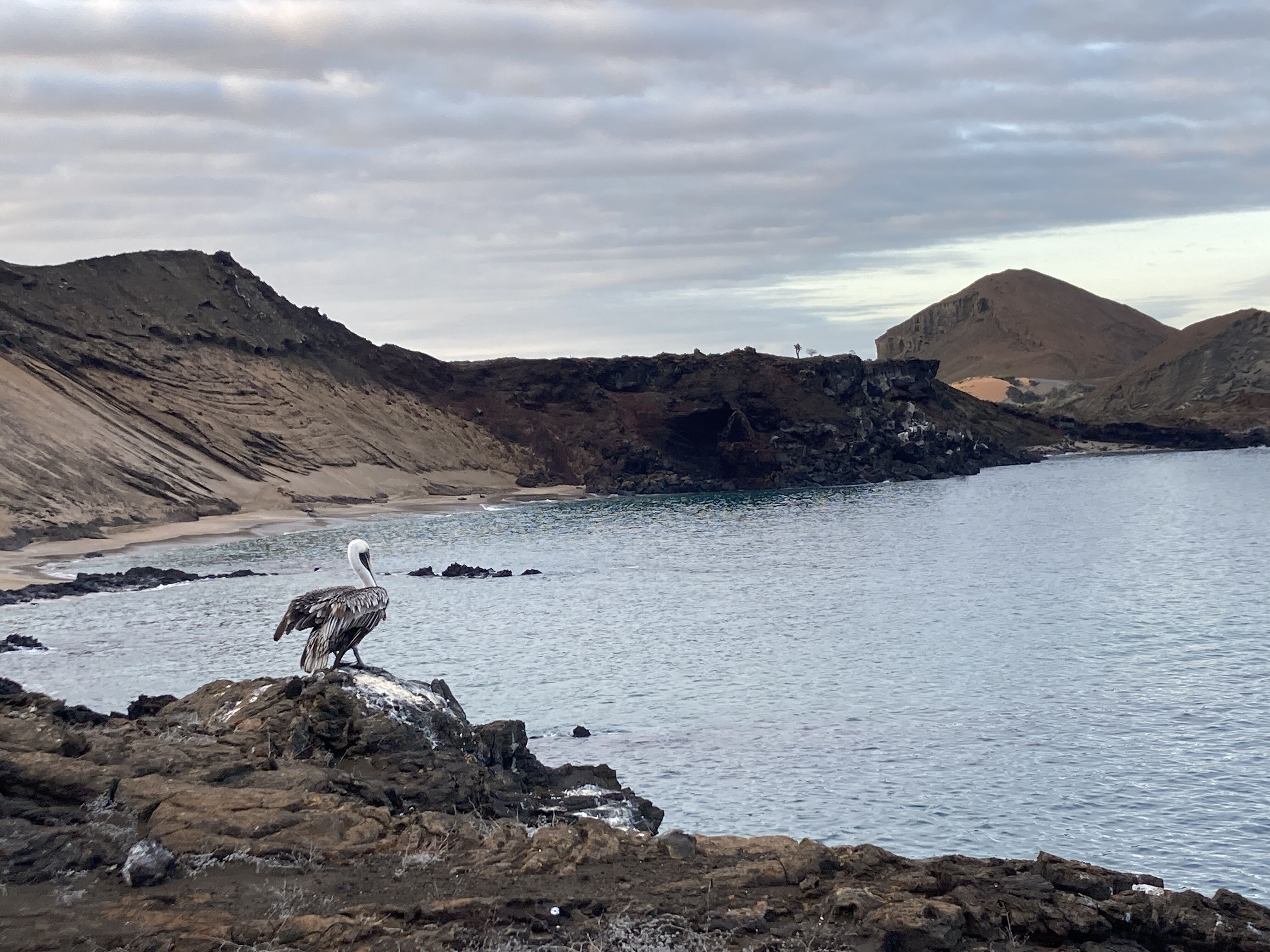 Midmorning, we spent a couple hours navigating to our next destination, the charming Santa Fe Island. Here we explored the bay in various ways. Some of us took a Zodiac tour to look for wildlife and observe scenic views of the cliffs. Others went snorkeling. In the last hours of daylight, we offered a hike in the dry forest to look for Santa Fe land iguanas.