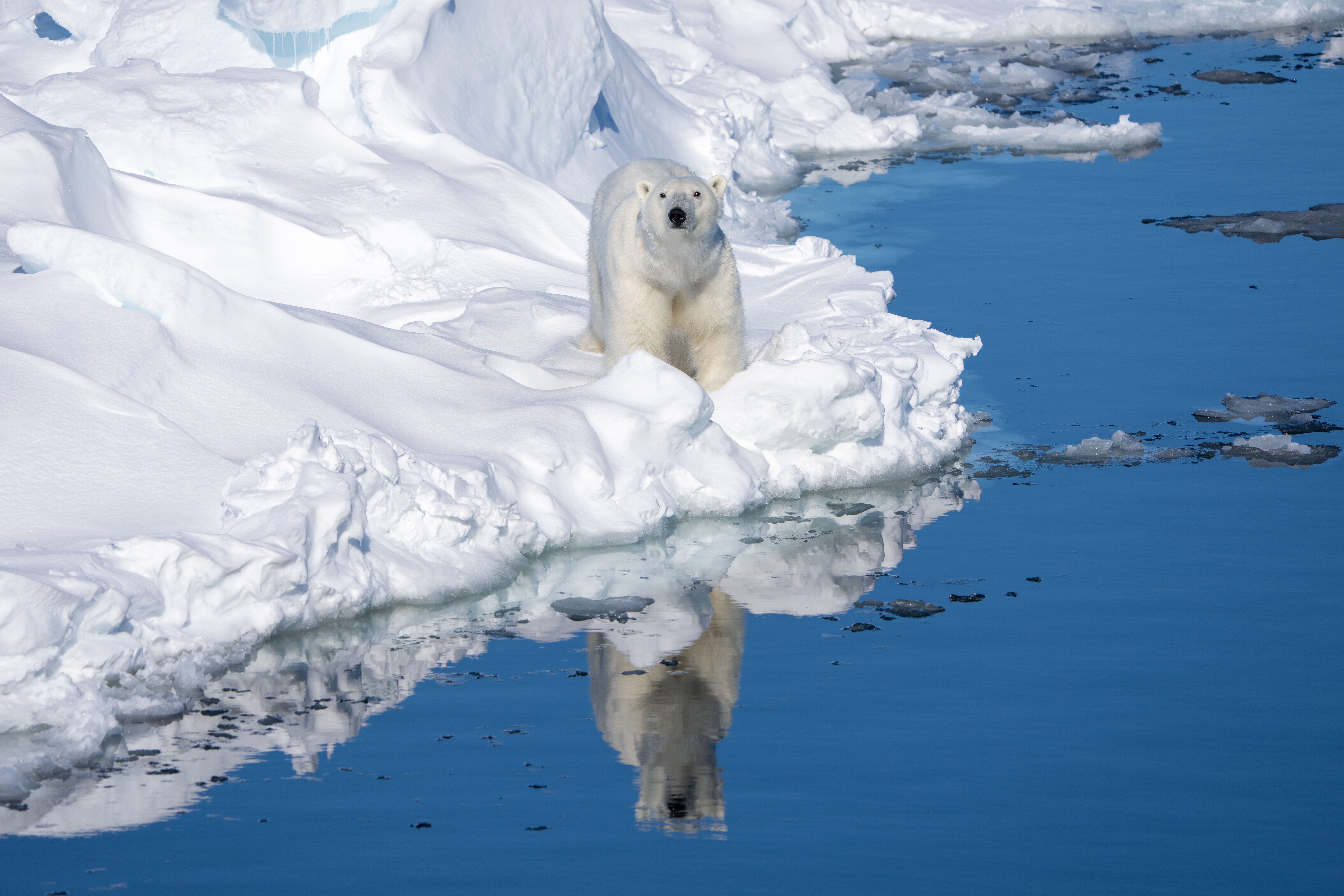 From here we sailed into St. Jonsfjorden amidst mountains and glaciers. A sheltered area proffered the opportunity once again to kayak and to go for short cruises in our expedition landing craft. Along the fast ice edge, there were several species of guillemots and gulls, as well as seals and walrus diving to find lunch. Distant glaciers glowed dark blue, and reindeer grazed in the nearby hills. Just enough time was left in the day to dash back to National Geographic Resolution, warm up, and make it to cocktail hour and recap before another scrumptious dinner to wrap up the evening.