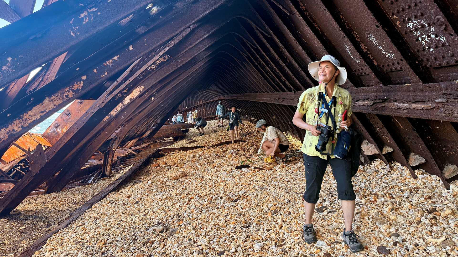 Our day at Takaroa began with a warm welcome from a small local community nestled within an aqua-blue, fast-flowing pass of a large lagoon. The guests were greeted by the quiet beauty of the island before embarking on a short journey aboard a local school bus. First stop, the incredible County of Roxburgh’s shipwreck. Standing inside this massive wreck, which measures 186 feet, was truly awe-inspiring, offering a rare glimpse into the island's maritime history.
