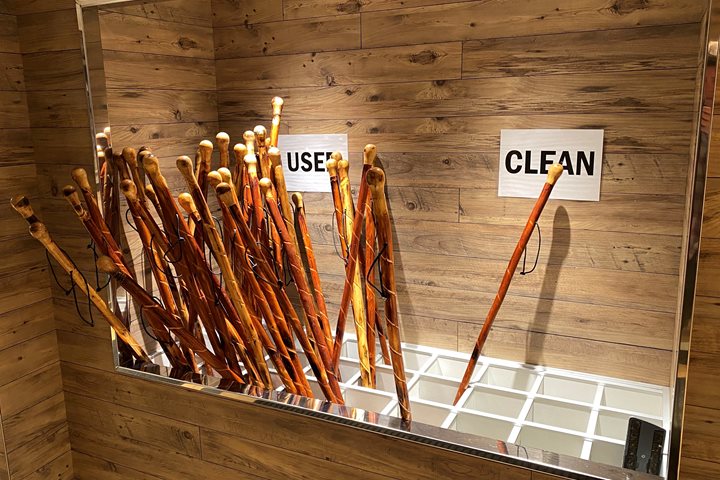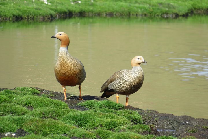 We scramble up and over rough rocks to reach a long stretch of white beach covered with bleached whale bones and dead kelp. Nearly a mile inland, through ankle-breaking tussac grass, we find a pond teeming with birdlife. Widgeons, grebes, and geese dot the water, while on a near shore, a half-dozen turkey vultures feast on a meal.